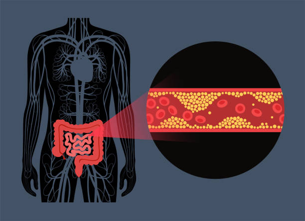 Mesenteric ischemia, cholesterol in human blood vessels. Colitis in intestine. Fat cells in vein artery. Blocked vascular in colon, embolism concept. Medical poster for clinic flat vector illustration